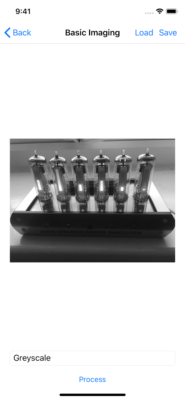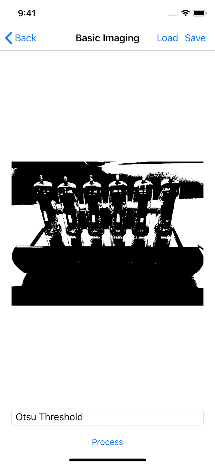 I also implemented Otsu’s thresholding algorithm, as an example of binarisation. This algorithm typically derives the threshold for an image by minimizing intra-class variance. However, the implementation I’ve used derives the threshold by maximising inter-class variance, which is equivalent. The threshold is then used to separate pixels into foreground and background classes. For more information about this algorithm, see Otsu’s method. The code for the algorithm can be found on GitHub. The following screenshot shows the test image thresholded with this algorithm, on iOS: