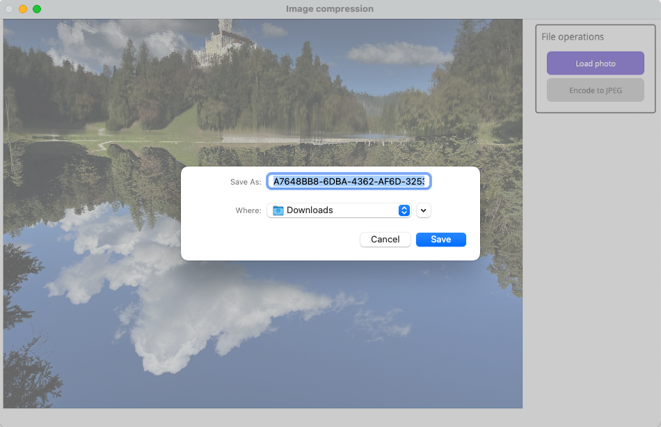 When you run the app you’ll see that it has a simple UI that displays buttons that let you load an image and encode it to JPEG: