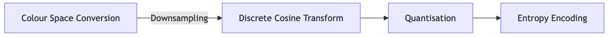 I’m not going to describe in detail how JPEG encoding works. For a detailed explanation, see JPEG on Wikipedia. Alternatively, for a simpler explanation see JPEG on Simple Wikipedia. However, a high-level overview of the JPEG encoding process is shown in the following diagram:
