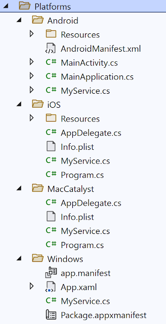 Then, in each Platform folder in the project, define the same partial class (in the same namespace) and the same partial method, but also provide the method implementation. This means you’ll have a MyService class in each of the four child folders of the Platforms folder in the solution:
