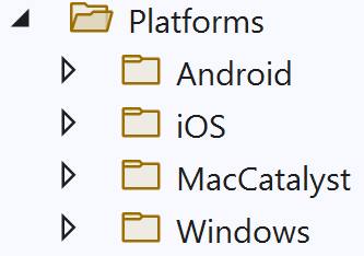 Each child folder of the Platforms folder represents a platform that .NET MAUI can target, and each child folder contains platform-specific code. At build time, the compiler only includes the code from each folder when building for that specific platform. For example, when you build for Android, the files in the Platforms > Android folder will be built into the app package, but the files in the other Platform folders won’t be. This approach, known as multi-targeting can be combined with partial methods and classes to invoke native platform functionality from cross-platform code.